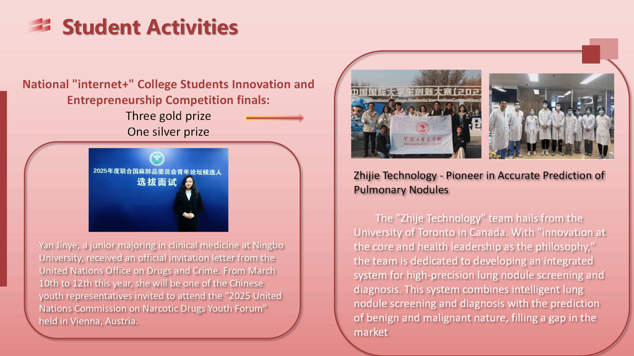 The center currently has 3,096 full-time students, including 55 doctoral students,948 masterstudents, 308 international students, and 2,093 undergraduate students; in addition, there are 1,115 studentswith equivalent academic abilities applying for a master's degree. In the past five years, students have won one national grand prize, second prize, and third prize each in the "Challenge Cup" National College Student Extracurricular Academic Science and Technology Works Competition, as well as one provincial grand prize and four first prizes. They have also won one first prize and one third prize at the provincial level in the "Challenge Cup" University Entrepreneurship Plan Competition, one silver prize in the National "Internet+" College Students Innovation and Entrepreneurship Competition finals, andfivegold awards, two silver awards and one bronze awardin the Zhejiang Province "Internet+" College Students Entrepreneurship Competition (two of which were awarded to international student teams). The overall employment rate of graduates has remained above 97% for three consecutive years, with an acceptance rate for postgraduate studies of 55.86% for the class of 2023clinical medicine undergraduates and 30.3% for the class of 2023preventive medicine undergraduates. According to statistics from the National Medical Examination Center, our department's clinical medicine undergraduates had a practical pass rate of 92.19%, a comprehensive exam pass rate of 93.16%, and an overall pass rate of 85.16% in the 2022 National Practitioner Qualification Examination, exceeding the national average by 14.75% points. The theoretical examination pass rate for 2022 master's students in clinical medicine was 98.98%, the clinical practice ability examination pass rate was 100%, and the total pass rate was 98.98%.