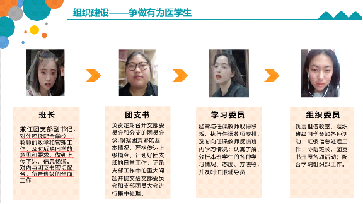 在校期间,团支部累计开展团日活动30次以上。在疫情期间也积极开展一系列活动,如全月示范性线上战役团日活动,线上学习动员会;积极响应返家乡的志愿服务活动;同时配合学院开展了“春天第一课”等医德医风教育活动,相关事迹也被学习强国、人民日报等主流媒体所报道。