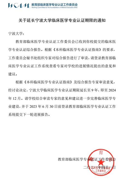 近日,教育部临床医学专业认证工作委员会正式通知,春满四合院 医学院临床医学专业认证有效期延长至9年,即从2015年12月至2024年12月。