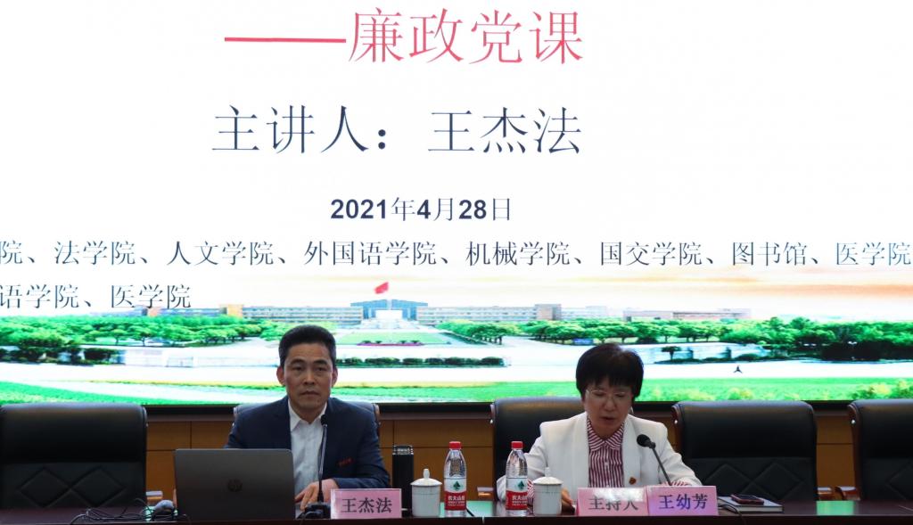 4月28日,商学院、法学院、人文学院、外国语学院、机械学院、国交学院、图书馆、医学院等8个单位部门联合举行党委理论中心组学习扩大会议,邀请校纪委书记王杰法作了题为《在实现事业发展和保障人员平安双重目标中履职尽责》的廉政党课。会议由医学院党委书记王幼芳主持。