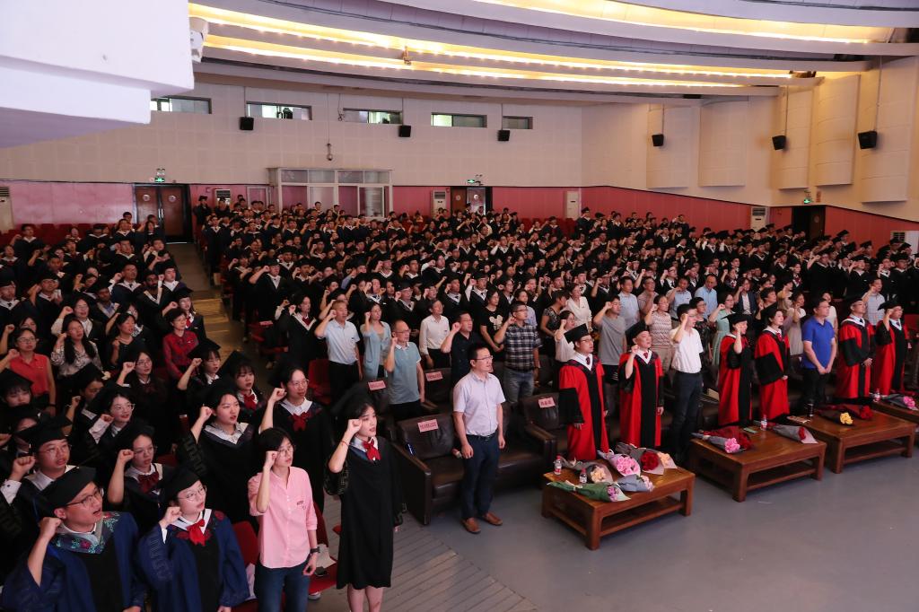宣誓仪式在庄严的国歌声中拉开帷幕。研究生李哲、罗怡爽,本科生黄荣荣以及留学生PRIYADHA作为毕业生代表分别发言。他们深情回顾了美好大学时光中的收获与成长,表达对同窗、恩师、母校的衷心的感谢以及真挚的祝福。