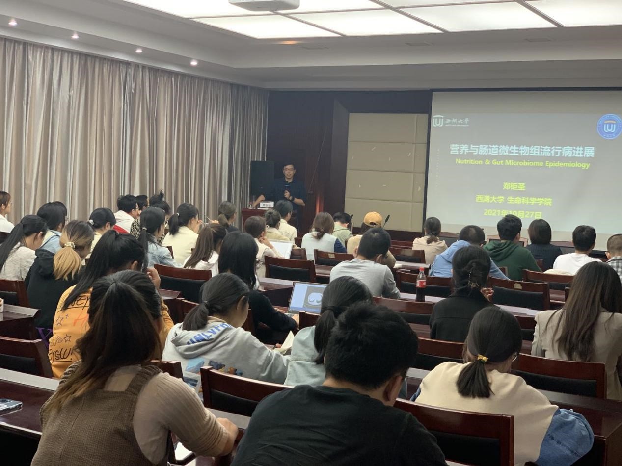 10月27日下午,春满四合院 优秀校友、浙江省万人计划科技创新领军人才、西湖大学生命科学学院研究员、博士生导师郑钜圣应邀来学院做了题为“营养与肠道微生物组流行病进展”的学术报告。