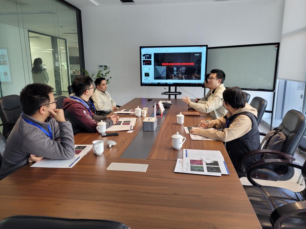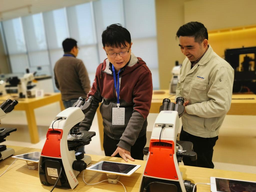 随后,一行人来到企业历史馆和陈列馆了解了企业的成长发展史,参观了该公司目前市面上的各种光学仪器。并在公司的研发部,听取了工程师关于显微镜的介绍,实地观看了共聚焦显微镜的成像效果。