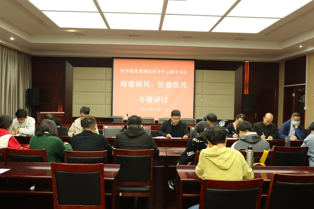11月17日下午,医学院党委召开理论学习中心组学习扩大会议,专题学习党的十九届六中全会精神,安排部署学习宣传贯彻工作;同时开展了“师德师风、医德医风”建设学习研讨。院党委常务副书记赵基源主持会议并讲话,学院党委理论学习中心组成员、全体师生党支部书记参加了会议。
