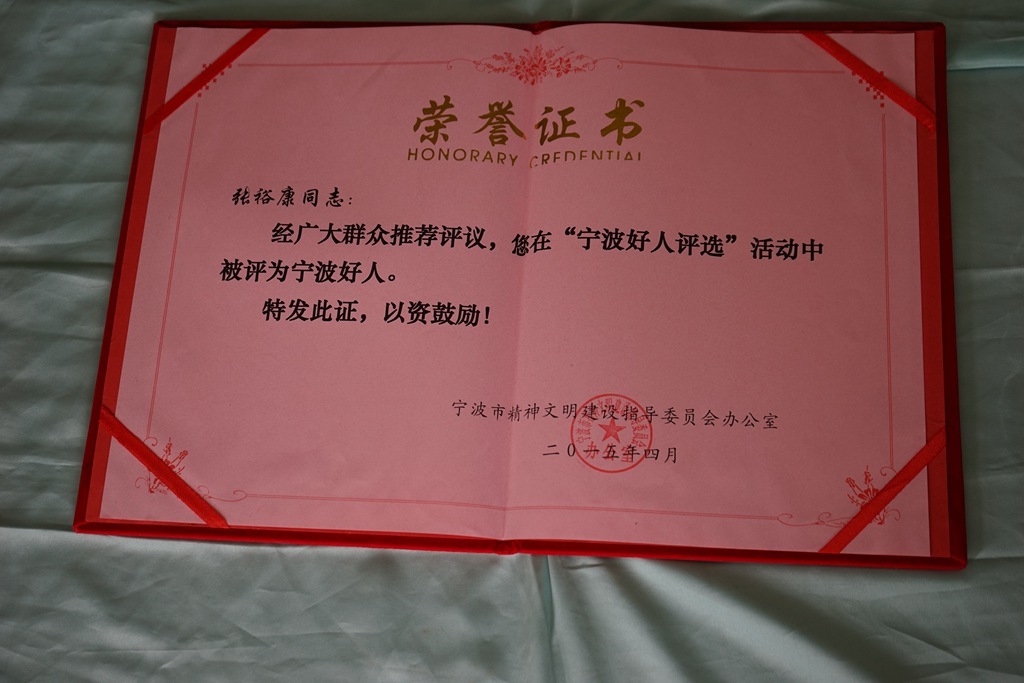 2015年,张裕康被评为“宁波好人”。