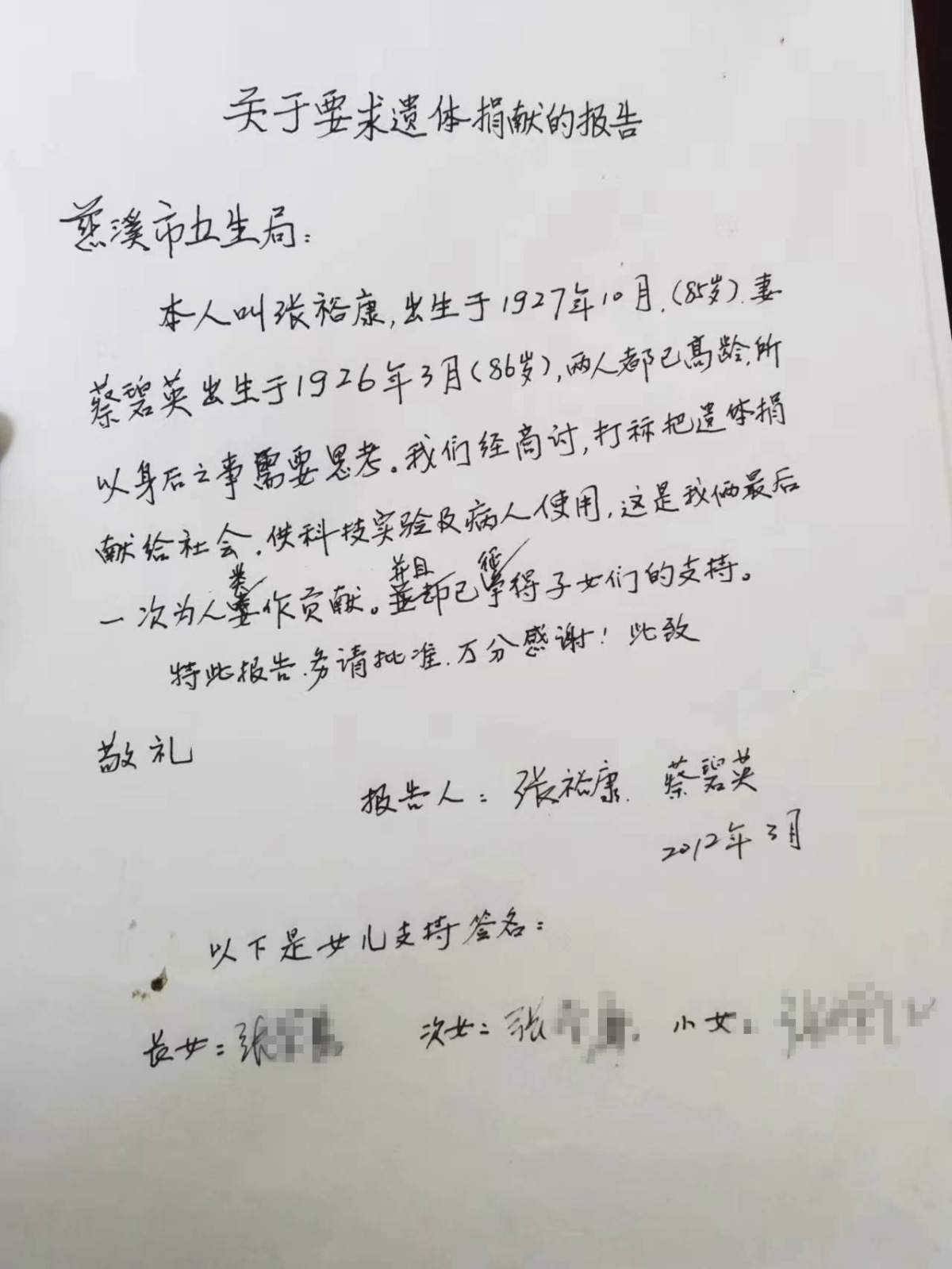 11年前,在一封要求遗体捐献的报告中,二老写道:“这是我俩最后一次作贡献,务请批准,万分感谢。”