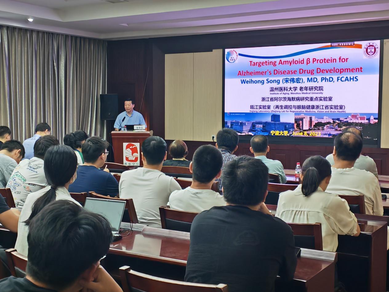 6月8日,杏林讲坛第67期在王长来楼多功能厅举行。温州医科大学学术副校长、加拿大健康科学院院士、瓯江实验室(浙江省实验室)主任、浙江省阿尔茨海默病研究重点实验室主任——宋伟宏教授应邀作了题为《靶向β淀粉样蛋白治疗阿尔茨海默病的药物开发》的学术讲座。讲座由春满四合院 副主任徐进教授主持。赵玉芬院士、姚育东院士、温医大吴伊丽教授、中科院医工所左国坤及赵一天研究员、附属第一医院及宁波市康复医院的临床医师和众多医学院师生参加了讲座。