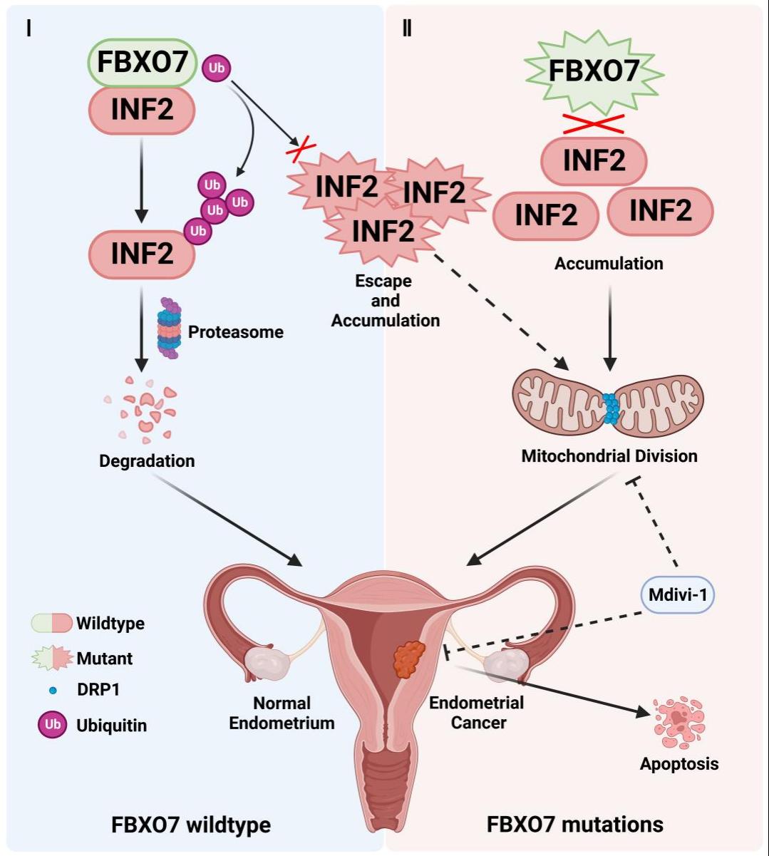 FBXO7蛋白是E3泛素连接酶Cullin 1家族的一个底物结合亚基,其基因在子宫内膜癌中存在高达6%的突变,且其mRNA和蛋白均在子宫内膜癌中显著丢失。但目前尚未有研究报道FBXO7蛋白和FBXO7基因突变与子宫内膜癌的发生发展之间的关联,金晓锋特聘研究员带领的研究小组通过免疫共沉淀技术和蛋白质质谱分析,鉴定INF2蛋白作为FBXO7蛋白的全新相互作用底物。INF2蛋白通过招募线粒体分裂所必需的DRP1蛋白定位于线粒体,从而触发线粒体的分裂,是最为重要的线粒体分裂形式之一。研究小组证明了FBXO7蛋白通过泛素化修饰降解INF2蛋白,从而抑制INF2蛋白依赖的线粒体分裂;而子宫内膜癌来源的FBXO7突变体在泛素化降解INF2蛋白的能力上存在缺陷,导致了INF2蛋白的蓄积,进一步招募并激活DRP1蛋白,触发线粒体的过度分裂,从而促进子宫内膜癌细胞的恶性增殖和迁移;此外,研究小组应用DRP1抑制剂Mdivi-1干预逆转了FBXO7-INF2-DRP1轴紊乱导致的子宫内膜癌细胞的线粒体过度分裂和增殖迁移能力的提升,并促进了肿瘤细胞的凋亡。