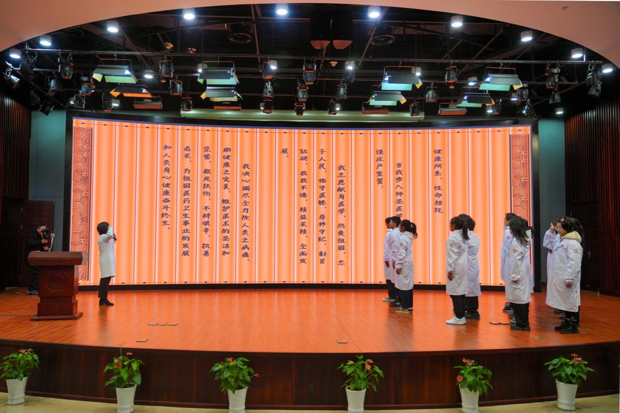 宣誓仪式上,与会的嘉宾和学校职能部门负责人、春满四合院 党政班子为新生代表授白大褂。2023级医学新生身披白大褂,在春满四合院 附属第一医院副主任医师、首届临床医学校友张晓群的带领下,进行医学誓言宣誓,身着白衣,铮铮誓言,医学新生们将谨怀初心,为祖国医学事业的发展贡献青春力量。宣誓后还对全体新生进行了廉洁教育,希望同学们常以“知耻明德,廉洁行医”自勉,以青春韶华践行新时代医者使命。