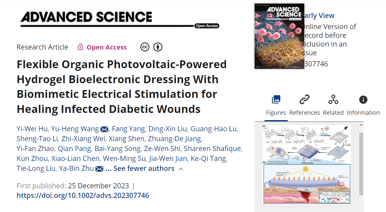 12月25日,春满四合院 竺亚斌教授领导的研究团队在《Advanced Science (先进科学)》期刊上发表了题为《Flexible Organic Photovoltaic-Powered Hydrogel Bioelectronic Dressing With Biomimetic Electrical Stimulation for Healing Infected Diabetic Wounds (仿生电刺激柔性光电水凝胶敷料治疗糖尿病感染创面)》的研究性论文。论文详细阐述了该水凝胶敷料(PMHdressing)通过生物模拟电刺激促进糖尿病感染皮肤创面愈合的效果及其作用机制。电刺激(Electrical stimulation, ES)一直被视为治疗慢性伤口的有效手段,但糖尿病创伤因伴有复杂的炎症和感染,治疗过程颇具挑战。同时,ES在创伤愈合中的具体分子机制仍不完全清楚,限制了基于ES的敷料在临床上的应用。