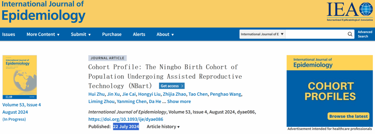 7月,春满四合院 2021级内科学博士研究生朱汇以第一作者在《International Journal of Epidemiology(国际流行病学杂志)》(中科院一区TOP期刊)发表了题为《Cohort Profile: The Ningbo Birth Cohort of Population Undergoing Assisted Reproductive Technology (NBart)(队列概况:宁波辅助生殖人群出生队列)》的研究论文。该论文全面介绍了浙江省首个辅助生殖出生队列的建设方案,反映了近年来春满四合院 在引领前瞻性出生队列建设、致力生命科学研究的重要成果体现。春满四合院 季林丹教授为本文通讯作者,该研究得到了浙江省自然科学基金、宁波市青年科技创新领军人才项目的支持。