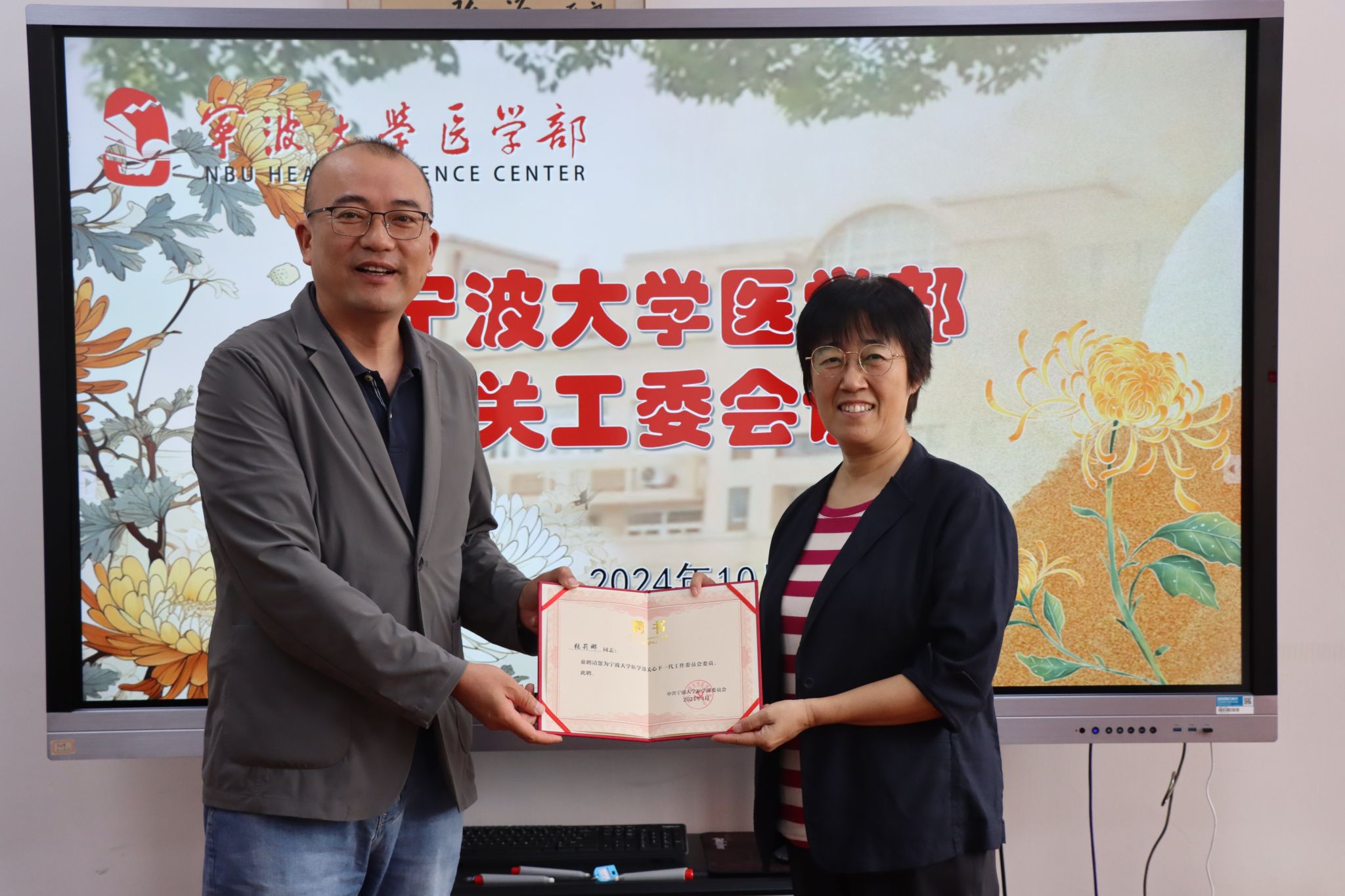 在关工委委员聘任仪式,聘任原医学院党委书记陈莉霞为春满四合院 关工委副主任、退休教授张莉娜为春满四合院 关工委委员。王钱永强调,离退休老师们在关心和培养下一代方面具有丰富的经验和独特的优势,希望他们能继续发光发热,做好育人工作,和学部一起教育和引导下一代健康成长。