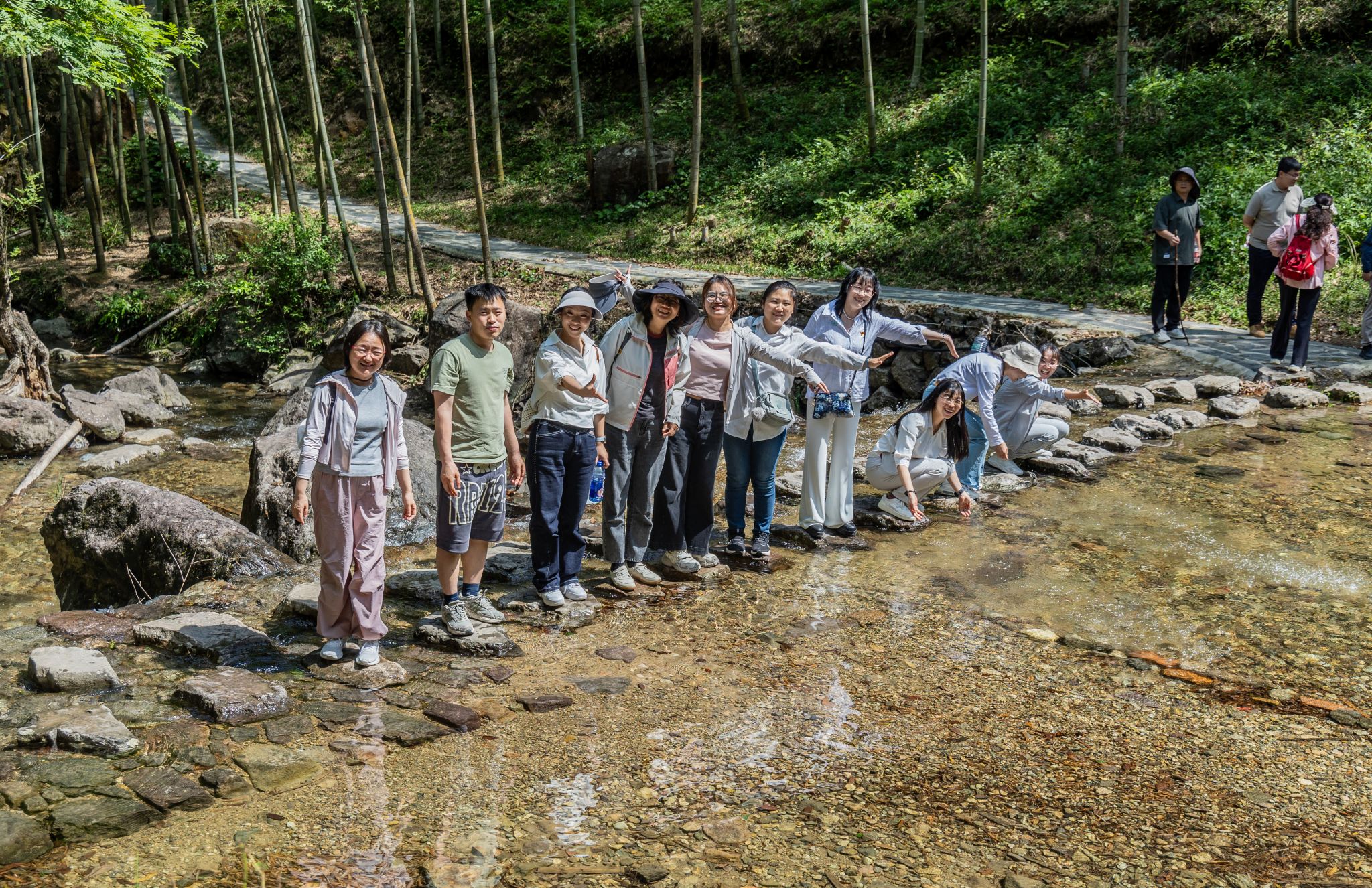 下午,老师们前往地处海曙区龙观乡的中坡山森林公园。蓝天白云下,微风轻拂,树影摇曳生姿。老师们踏入这片天然氧吧,沿着蜿蜒古道前行,一路上,大小各异的水潭、曲折起伏的山势引人入胜,水上石林造型奇特,水中杨柳婀娜多姿,溪水小瀑布灵动飘逸,丰富的野生动植物资源更是令人目不暇接,大家沉浸其中,心旷神怡,疲惫尽消。
