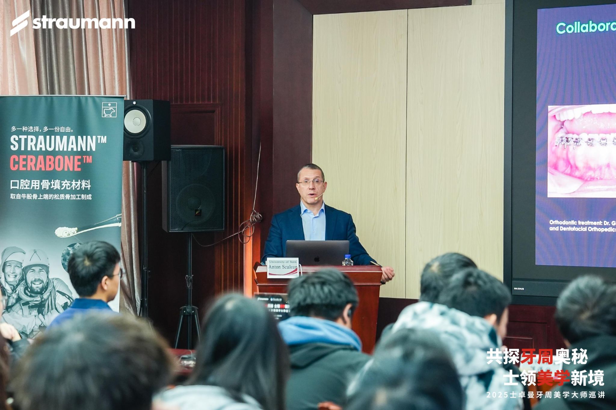 Anton Sculean教授是国际牙周病学领域公认的权威专家,现任瑞士伯尔尼大学牙科学院牙周病学教授及系主任、牙科研究中心(DRC)负责人,同时担任全球顶尖牙科期刊《Periodontology 2000》主编,并被评为全球牙周病领域排名第一的专家(Expertscape 数据)。本次讲座聚焦口腔前沿技术——隧道技术在牙周软组织再生领域的应用。针对牙龈退缩引发的牙根敏感、根面龋、美学缺陷等临床难题,Sculean教授基于20余年隧道技术的实际操作经验,系统梳理了隧道技术的发展沿革、疗效评价体系及技术改良路径,并结合大量临床图片与手术视频,生动展示了该技术在微创性、美学效果、长期稳定性及操作便捷性等方面的显著优势,以及自体结缔组织移植、手术入路设计、缝合固定方式等关键操作细节,让在场师生直观领略了这一前沿技术的魅力。