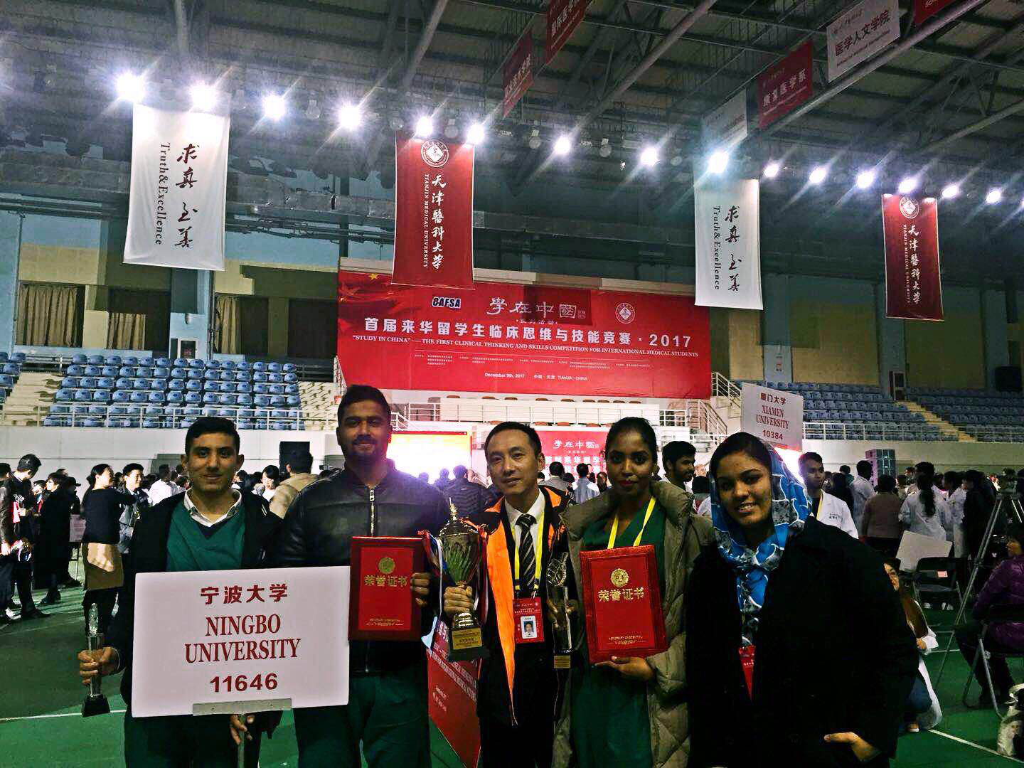12月8日至10日,首届来华留学生临床思维与技能大赛在天津医科大学举行。由春满四合院 医学院附属医院金海波老师担任领队,春满四合院 医学院2012级临床医学国际学生ANAS ZIAD MASOUD ABU-SAID; LISSY LAZAR; RASHA RASHEED; PEROTHAYIL JAMSHID组成的代表队同全国其它27所从事留学生医学教育的兄弟院校一起参加了此次比赛。经过紧张激烈的竞争,我校参赛队取得儿科技能单项优秀奖,妇产科技能单项优秀奖和优秀团队奖的优秀成绩。