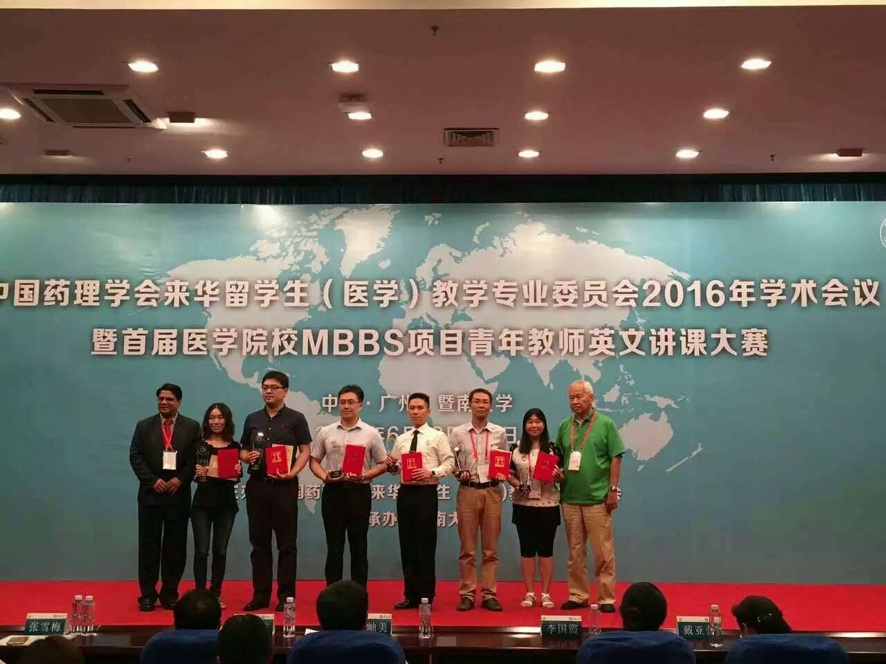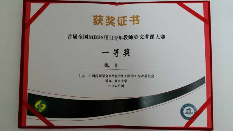 在6月20日结束的首届全国医学院校来华留学生临床医学专业英文授课(MBBS)青年教师讲课大赛中,我校医学院魏华博士以流利的英文表达、创新的教学方法和活泼的课堂氛围深受专家和学生评委的好评,最终荣获一等奖。本次大赛由中国药理学会来华留学生(医学)教学专业委员会主办,暨南大学承办,来自全国医学院校的50多位青年教师参加了英文讲课大赛。比赛总分由三部分组成,教案10分,专家评委70分,留学生代表评委20分。魏华博士在专家和留学生代表评分环节表现突出。