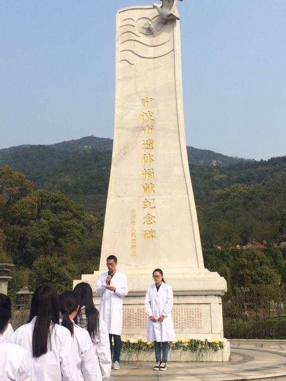 3月27日上午,医学生们身着白大褂踏入九龙湖大同第五墓园,穿过挺拔的劲松林,来到宁波市遗体捐献纪念碑前,怀着沉重的心情祭奠和缅怀无私奉献的无言良师们。