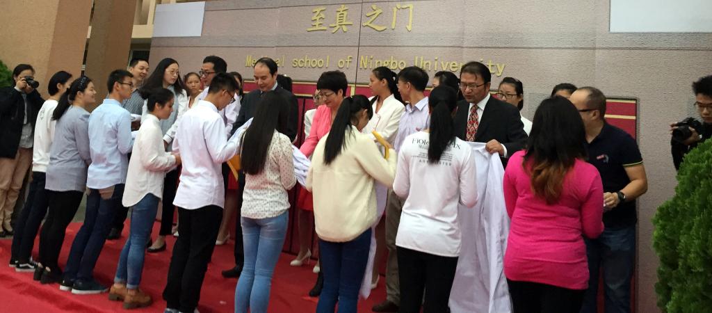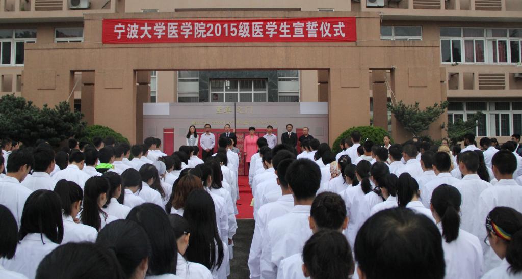 上午6时50分,伴随着庄严的旋律,四名医学类国防生们,身着洁白的制服昂首阔步,护送院旗进入至真之门,在场师生高唱《春满四合院 医学院院歌》,“学精于勤,技进于心,师生医德,博学守仁”高亢激昂的院歌响彻人心。随后,进入最庄严环节,领导和嘉宾为新生代表授予白大褂,并在医学院附属宁波市第一医院急诊科陈志华副主任医师的带领下,立下了“健康所系,性命相托”誓言。陈志华医师和医学院青年教师崔巍,从青年医生的责任与担当角度为大家讲述了属于家讲述了自己的 “白大褂情结”,中外医学新生代表们则表达了自己穿上白大褂时的兴奋以及对未来的憧憬,为大家勾画了新一代医学人的“医学梦”。当与会领导和学生代表放飞手中梦想鸽之时,标志着新医学人的梦想已经启航,也预示着医学院正朝着高水平、有特色、国际化的目标不断迈进。