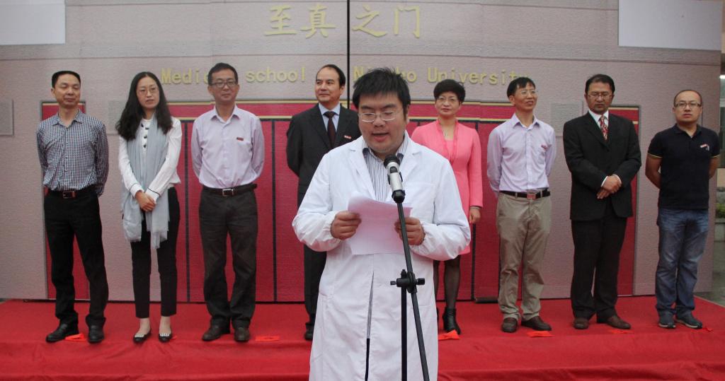 医学院执行院长周文华发表了激情洋溢的双语讲话。他希望医学生努力传承“兼容并包,自强不息,务实创新,与时偕行”的宁大精神,牢记“博学守仁”的医学院院训,勉励广大医学生担任起捍卫人类健康和生命的职责,铭记医学生誓言,努力学习理论知识和专业技能,做到真才实学,实现知识、能力、素质的全面提升。