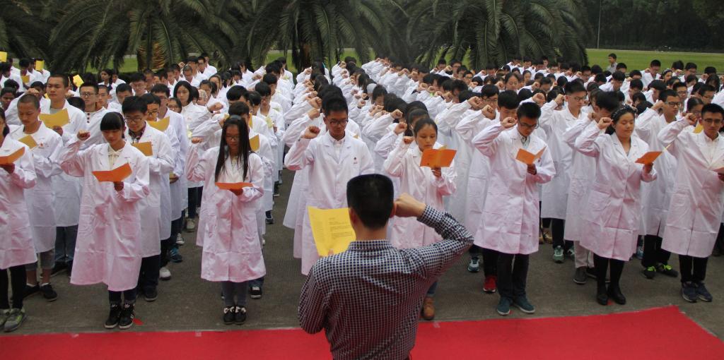 医学生宣誓仪式是医学院着眼于学生医德医风教育、人文素养提高开展的一项传统文化活动,至今已连续开展17年。随着学院国际化办学的推进,自2012年起,采用中英文双语模式进行。该活动是我校校园文化“一院一品”品牌项目,也是医学生在学业和职业生涯中的一场具有特殊意义的精神洗礼,为师生关注和称道。