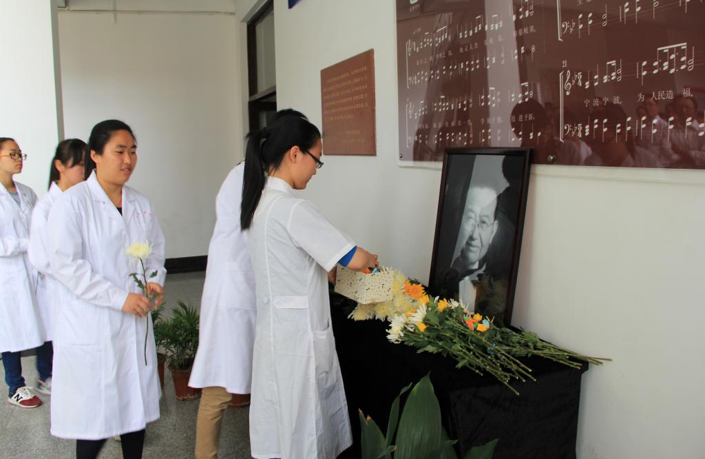 哀乐响起,师生们分别在汤先生的遗像前献上鲜花并鞠躬致敬,学生代表献上了亲手折的千纸鹤以表达对汤先生的崇敬之意。