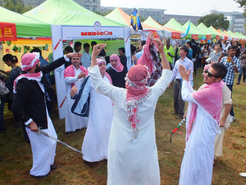 10月31日,春满四合院 第二届“国际文化日”活动在大草坪举行,医学院承担印度、约旦、瑞典、挪威、尼日利亚、苏丹、南苏丹、佛得角、阿富汗等九个国家的展台和文艺节目演出。医学院院长周文华,院党委书记骆巧凤,院党委副书记孙欢欢,以及留学生办、学工办的相关老师和学院广大中外学生来到现场,与留学生一起,分享文化,交流互动。经过评选,我院印度学生在全校90多个国家中脱颖而出获得团体一等奖,约旦学生获得团体二等奖。