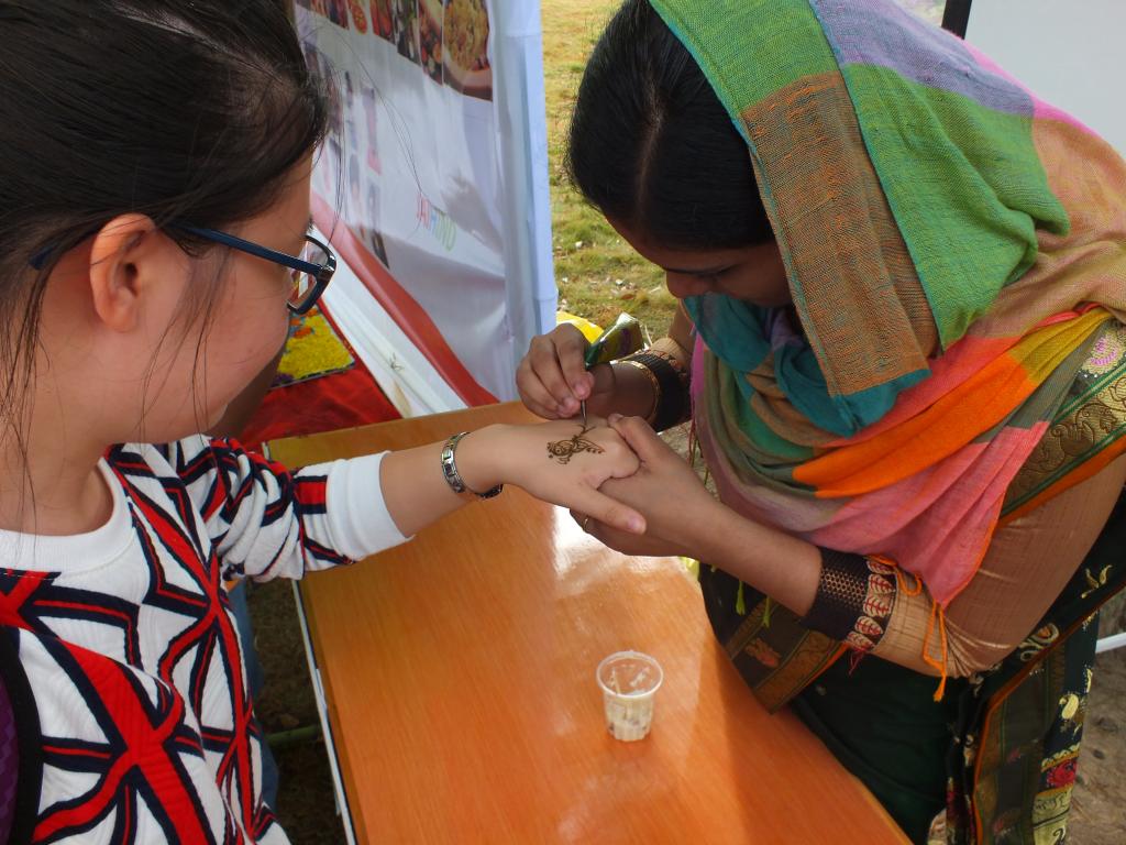 活动现场,留学生们精心布置了各自国家的展台,以图片、视频、民族服饰、传统舞蹈、特色美食、工艺品展示等多种形式,充分展现了本国的风土人情和特色文化。身着印度传统服装“莎丽”的美女留学生一边介绍鲜花花瓣拼成的孔雀图案,一边给围观的中国女生点起了朱砂;约旦学生裹着头巾、身穿民族服装、佩戴腰带,充满活力和野性的民族舞蹈吸引了众多师生观看;瑞典展台前围满了争相品尝地道美食的中外学生,留学生用彩笔在每位来客手背上精心绘制着瑞典国旗;苏丹留学生忙碌地给大家展示本国独有的特色服装和香料。整个现场这边欢呼声刚落,那边又传来一片掌声和惊叹声。