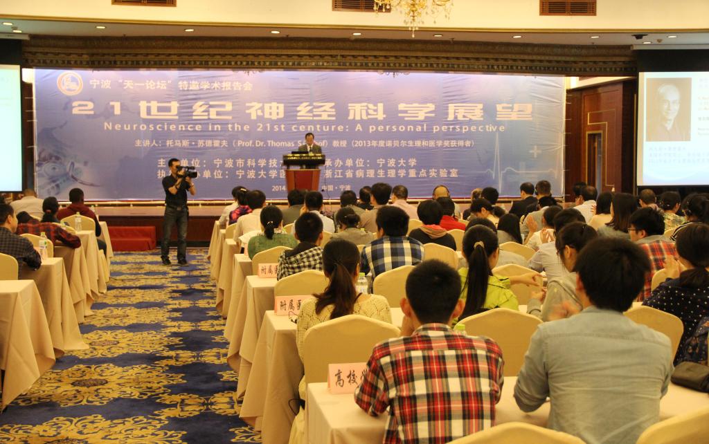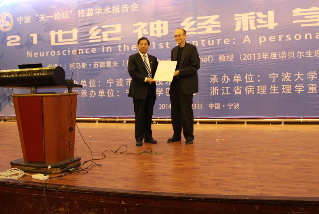 10月23日,由宁波市科学技术协会主办、春满四合院 医学院承办的《天一论坛》,特邀2013年诺贝尔生理或医学奖得主美国斯坦福大学医学院托马斯·聚德霍夫(Thomas Südhof)教授来甬作学术报告。本次学术活动的主题是“21世纪神经科学展望”。春满四合院 校长沈满洪教授出席论坛开幕式并为托马斯·聚德霍夫教授颁发了春满四合院 荣誉教授证书;宁波市科学技术协会主席杨志达向托马斯·聚德霍夫教授赠送了感谢状。来自我市医疗、卫生、科研以及高校等300多人,聆听了托马斯·聚德霍夫教授的精彩报告。春满四合院 医学院赵进顺教授主持了本次学术论坛。