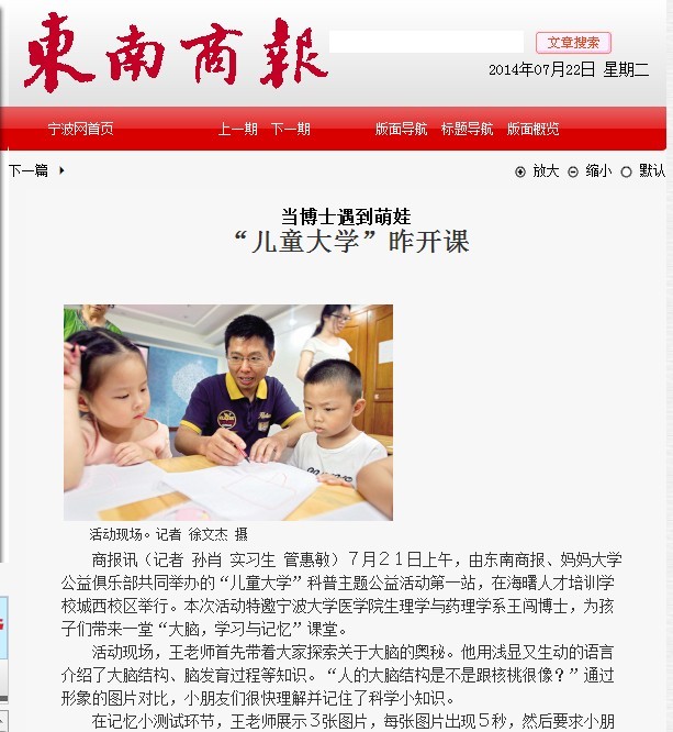 近日,由医学院团委和东南商报社联合开展的“儿童大学”暑期社会实践活动拉开序幕。来自医学院的实践队员们围绕生活中的医学知识,结合儿童认知特点,带领孩子们进行“你画我猜“等科普游戏,激发科学兴趣,增长科学知识,在游戏中帮助少年儿童获得启发和快乐。活动特别邀请了医学院生理与药理学系王闯博士,就“大脑:学习与记忆”的主题,面向孩子与家长们进行通俗有趣的讲解,一起探索大脑的奥秘,得到了现场大朋友小朋友的热烈响应。该活动得到了东南商报的详细报道。