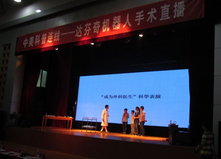 此次子宫肌瘤摘除手术由迈克尔·皮特博士主刀,迈克尔·皮特博士是妇科机器人微创手术首席医生,是公认的全球机器人手术和教学的领军人物,一直工作在微创机器人手术的最前沿。中美科普连线直播过程中,在美国纽瓦克贝斯以色列医疗中心手术室里,达芬奇机器人静静地站在那里,它由三部分组成:外科医生控制台、床旁机械臂系统和成像系统。主刀医生皮特佩戴一个无线麦克风进行实时讲解,麻醉师详细讲解相关的麻醉手段、设备、检测等。在整个过程中,现场观众可以看到手术过程中的所有细节,主刀医生进行实时讲解,并即时回答现场观众的提问。对于本科生和留学生来说,这是他们一次与机器人手术中的医生及手术室其他人员展开互动的宝贵机会。