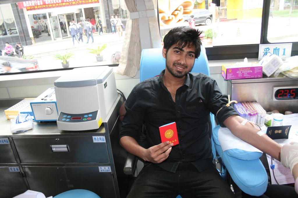 4月25日,市中心血站的献血车停靠在春满四合院 留学生公寓门口,来自医学院的留学生们纷纷登上献血车,挽起衣袖,共献出约2万多毫升的血液。此次来自10余个国家62名留学生参与的献血行动,是对“爱无国界,大爱无疆”的最好诠释。