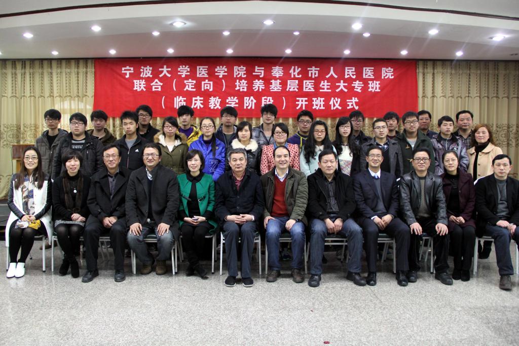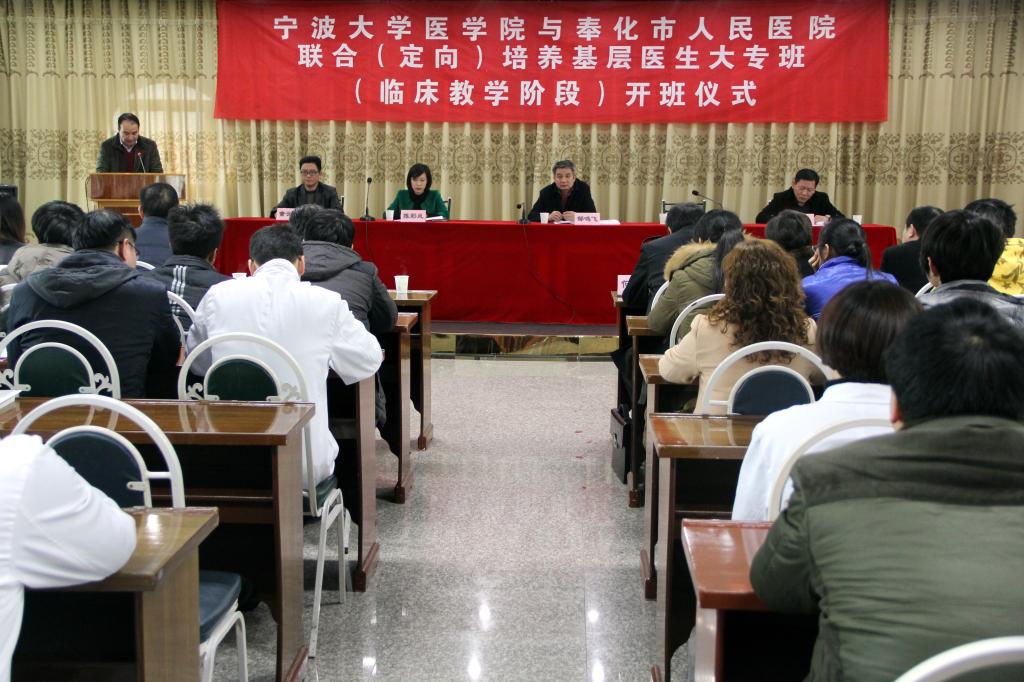 2月28日下午,春满四合院 医学院与奉化市人民医院联合(定向)培养基层医生大专班(临床教学阶段)开班仪式举行。宁波市卫生局副局长邹鸣飞、奉化市副市长陈彩凤、奉化市卫生局局长余磊、宁大医学院党政班子成员、奉化人民医院党政班子成员和各科室教师代表,医学院2012级临床医学大专班学生参加了开班仪式。开班仪式由奉化市人民医院院长童云龙主持。