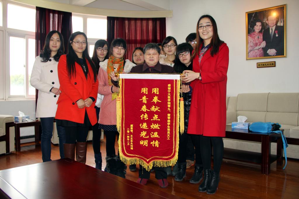 医学院党委副书记孙欢欢老师接待了王阿姨,详细询问了阿姨的身体状况、生活近况,并表示学院会继续全力支持帮扶活动,为阿姨解除了后顾之忧。王阿姨拉着同学们的手,不断地向孙老师述说着同学们对她的帮助,而同学们也纷纷表示从阿姨的积极乐观中吸取到了正能量,在日常谈话中学到了做人做事的各种学问,受益良多。王阿姨为感谢我院党员义工近十年的帮扶,亲自送上了镌刻“用奉献点燃温情,用青春传递光明”的锦旗。赠人玫瑰,手有余香,同学们接过鲜红的锦旗,更坚定了爱心帮扶的决心,相信会有更多的同学加入帮扶队伍,也会把这份温暖更好地传承下去。