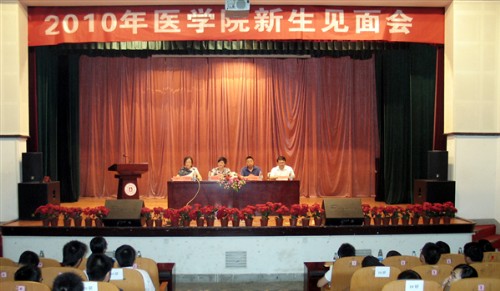 9月15日下午,锦绣小剧场济济一堂,2010年医学院新生见面会在这里举行。见面会由学院党总支副书记孙欢欢主持。院党政领导班子,教学科研办、学工办相关老师,新生班主任,全体2001级新生和转入学科性学院的09级医学生参加了本次会议。