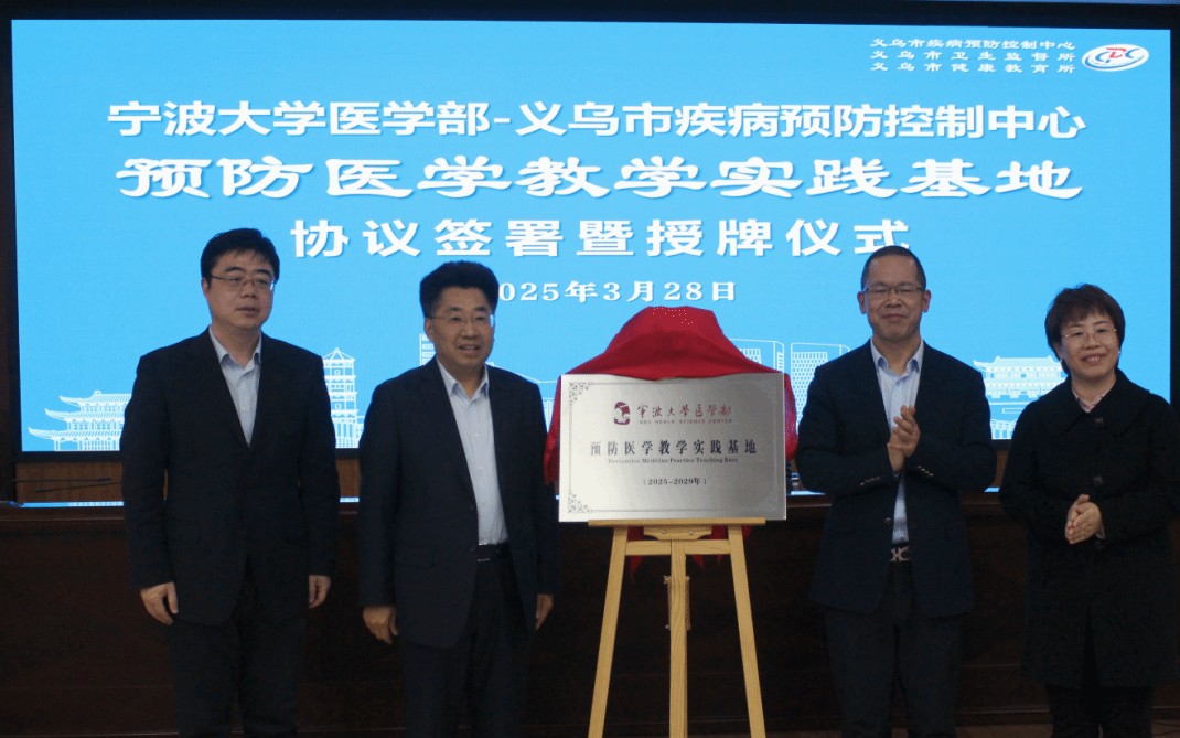 On March 28, Professor Xu Guozhang, Deputy Director of the Ningbo University Health Science Center and Dean of the School of Public Health, led a delegation to Yiwu City to attend the Agreement Signing and Plaque Awarding Ceremony for the Preventive Medicine Teaching Practice Base between the Ningbo University Health Science Center and Yiwu Center for Disease Control and Prevention (CDC). Fang Bin, Deputy Director of Yiwu Health Bureau and Director of the Disease Prevention and Control Bureau, and Jiang Jun, Secretary of the Party Committee and Director of Yiwu Center for Disease Control and Prevention, attended the event.