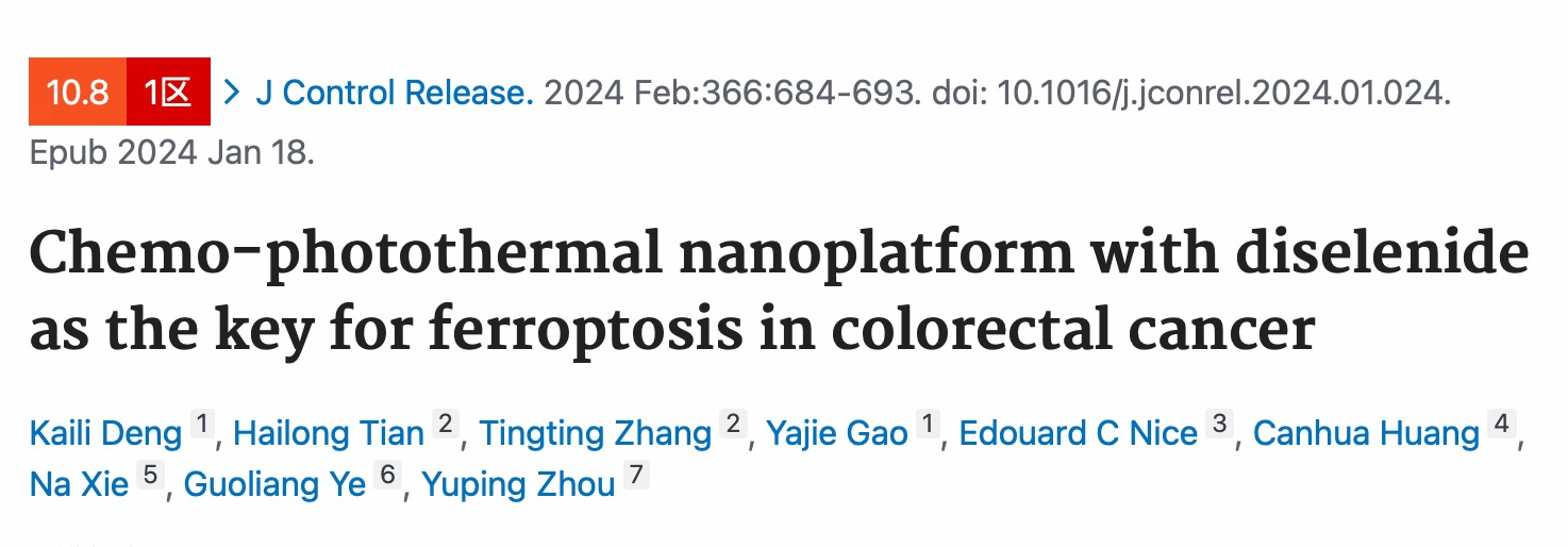 Recently, Deng Kaili, a 2020-level master's student specializing in internal medicine from the Medical Department, served as the first author to publish a research paper titled "Chemo-photothermal nanoplatform with diselenide as the key for ferroptosis in colorectal cancer" in the journal "J Control Release" (a top-tier SCI dual-zone journal with an impact factor of 10.8). The main corresponding author of the paper is her advisor, Dr. Zhou Yuping from the First Affiliated Hospital of Ningbo University. Co-corresponding authors include Chief Physician Ye Guoliang from the First Affiliated Hospital of Ningbo University and Associate Researcher Xie Na from the Basic Medical College and Forensic Medicine College of West China at Sichuan University. Co-first author of the paper is Dr. Tian Hailong, a graduate student from Sichuan University. Additionally, the research was guided by Professor Huang Canhua from the National Key Laboratory of Biotherapy at Sichuan University.