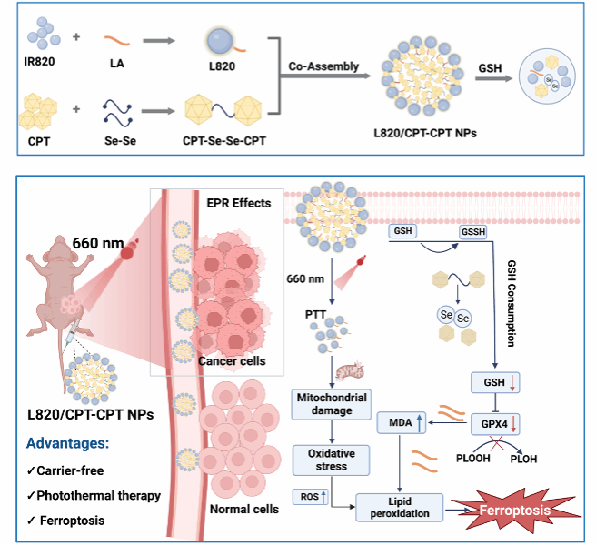 The study designed a novel camptothecin-loaded nanoparticle to enhance its efficacy against colorectal cancer (CRC) and elucidated its mechanism of action through a pathway that induces ferroptosis combined with photothermal therapy, offering a new strategy for the treatment of mid-to-late stage CRC. Globally, colorectal cancer (CRC) ranks third in both incidence and mortality rates among all types of tumors, with a trend towards affecting younger individuals becoming increasingly apparent. For patients with advanced CRC who are not candidates for surgical treatment, molecular targeted chemotherapy is an emerging therapy. Camptothecin (CPT) is one of the anticancer drugs approved by the U.S. FDA, but its poor water solubility, low biocompatibility, short retention time at the tumor site, and systemic toxicity associated with non-targeted drugs limit its application. This study leveraged a new type of photosensitizer, IR820, to prepare a novel camptothecin-loaded nanoparticle, overcoming its inherent drawbacks and achieving targeted drug delivery and controllable release. It also realized multifunctional synergy between photothermal therapy and chemotherapy. In vivo and in vitro experiments validated its significant clinical efficacy and good safety profile within the body.