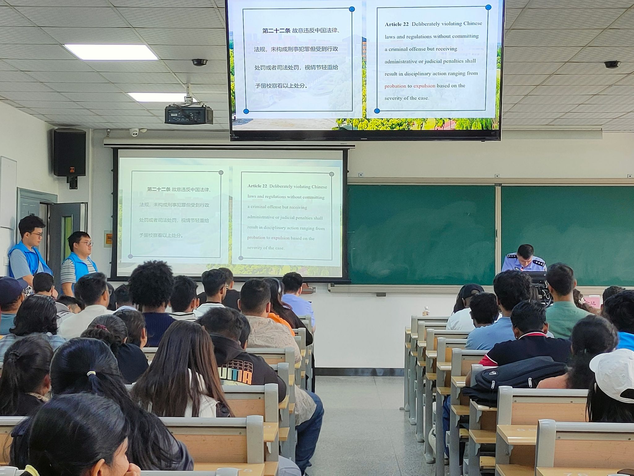 Focusing on the practical needs of international students' study and life in China, Officer Yu systematically sorted out key areas such as visa management, traffic safety, and legal responsibilities in the form of "Ten Questions," providing in-depth interpretations of relevant laws and regulations and their underlying legal logic. Through analyses of real cases, he vividly explained the importance of abiding by Chinese laws and school rules, helping international students "understand not only the facts but also the reasons," and effectively enhancing their legal literacy and risk prevention capabilities. Officer Yu emphasized that laws and regulations are the cornerstone for ensuring a safe and orderly study abroad life, calling on international students to take the initiative to learn and strictly observe Chinese laws and school regulations, so as to "know the bottom line, understand discipline, and abide by laws and regulations," and build a solid safety barrier for their academic development.